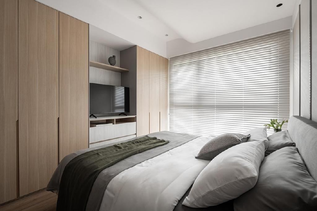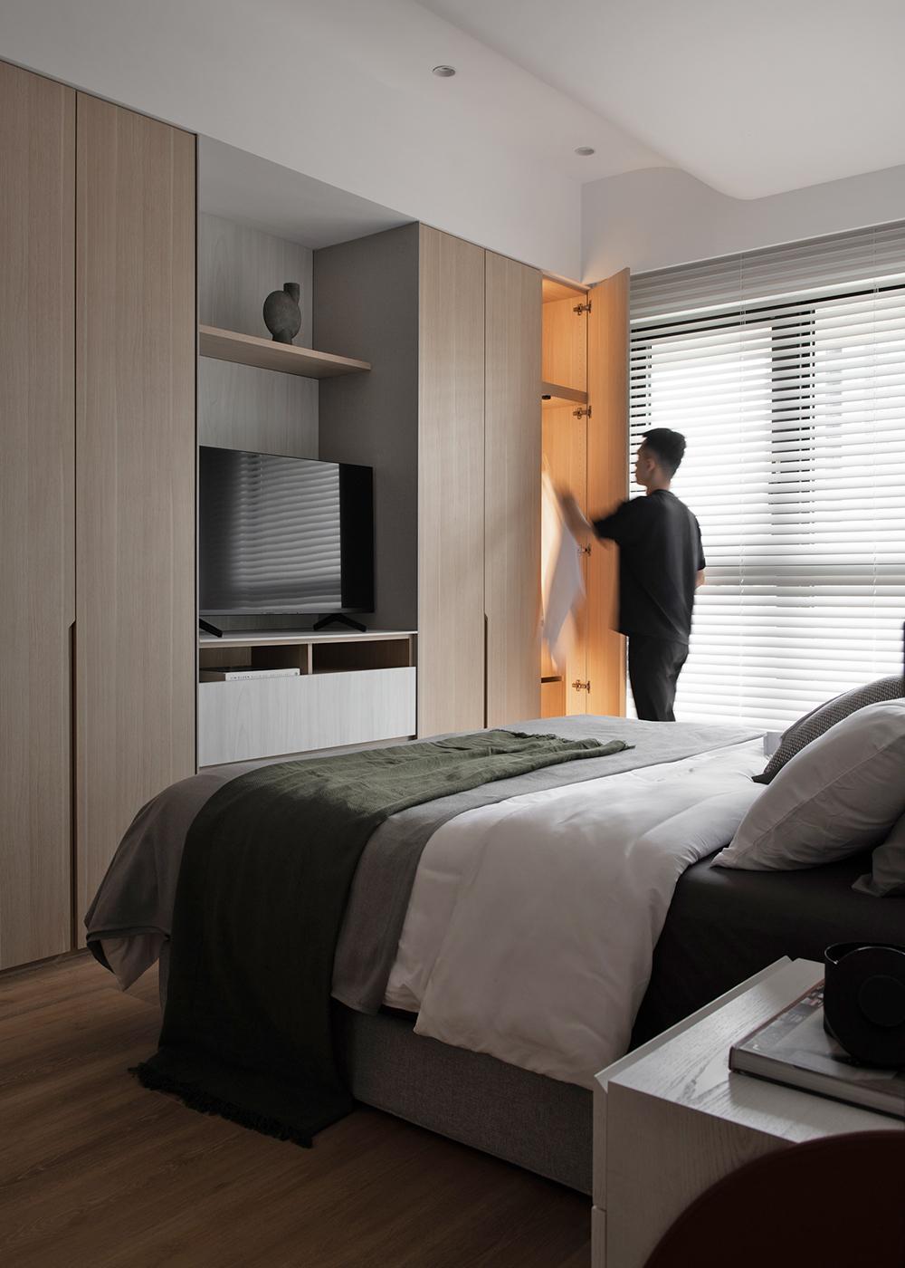整面墙的定制家具整合了梳妆台、电视墙、衣柜,也为节省空间,给未来婴儿床留下了空间。