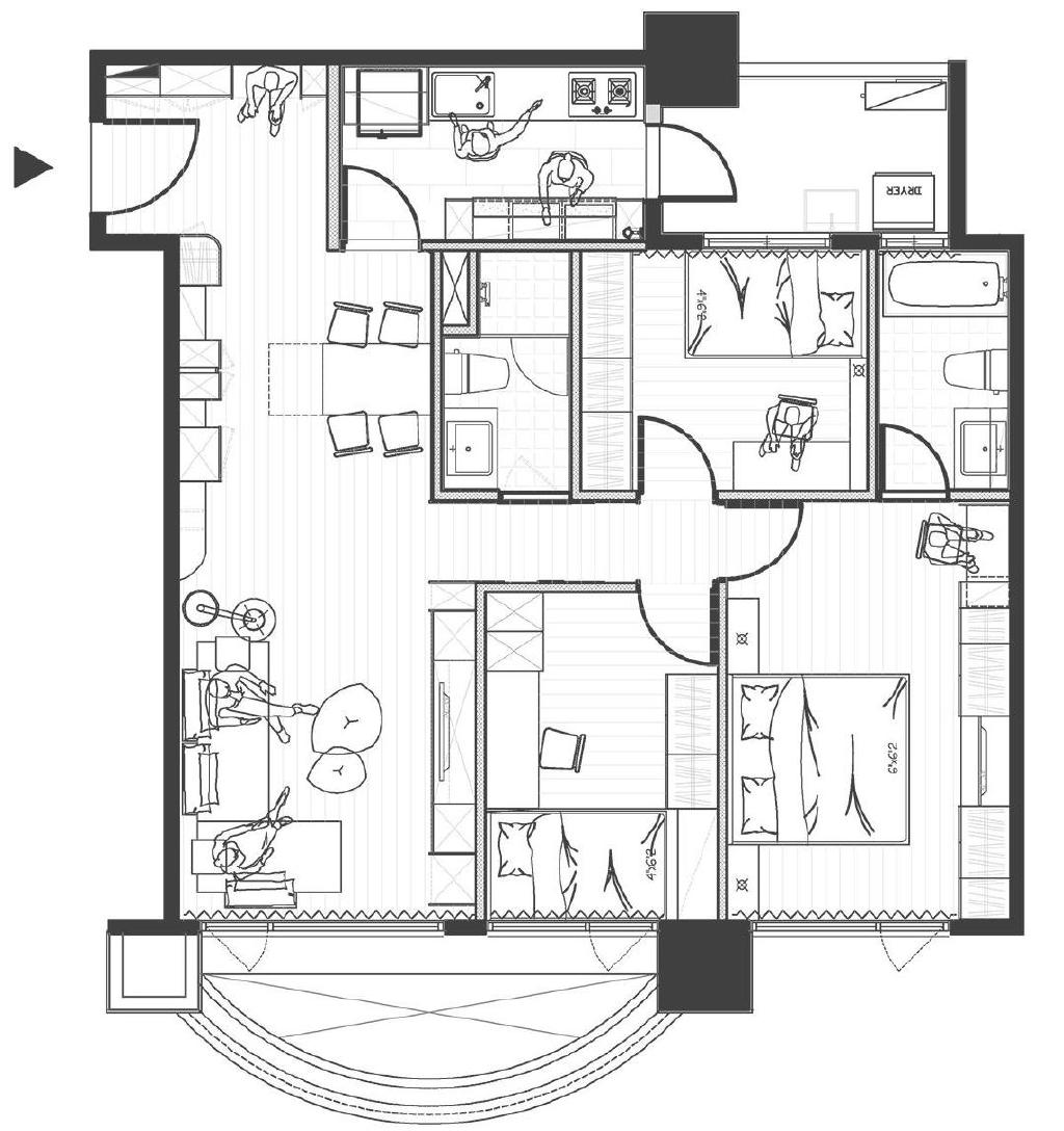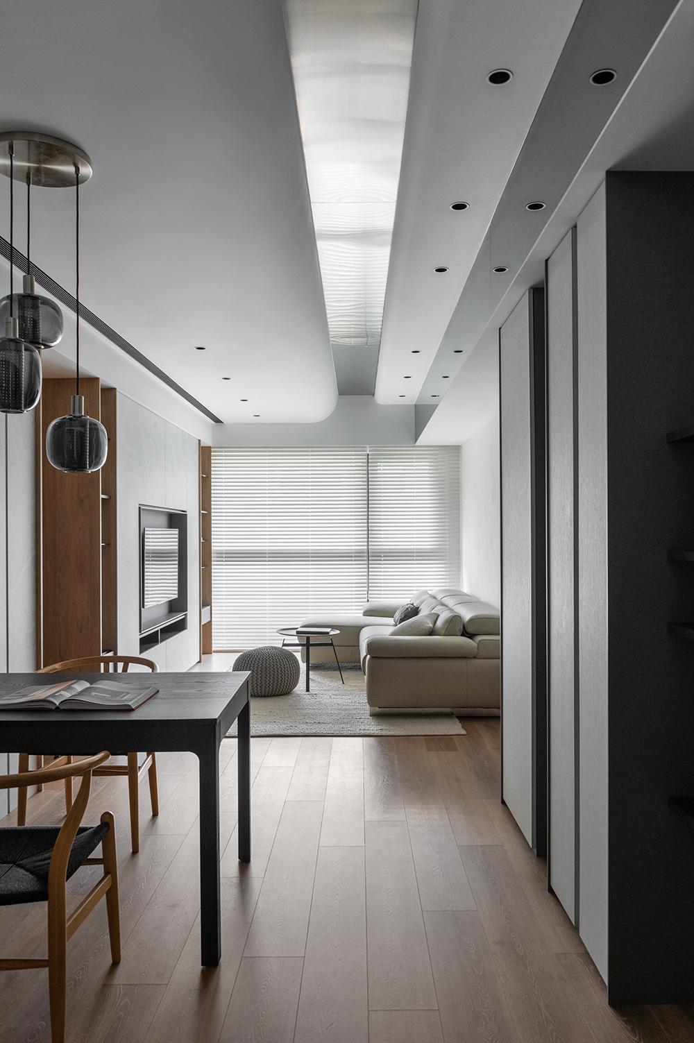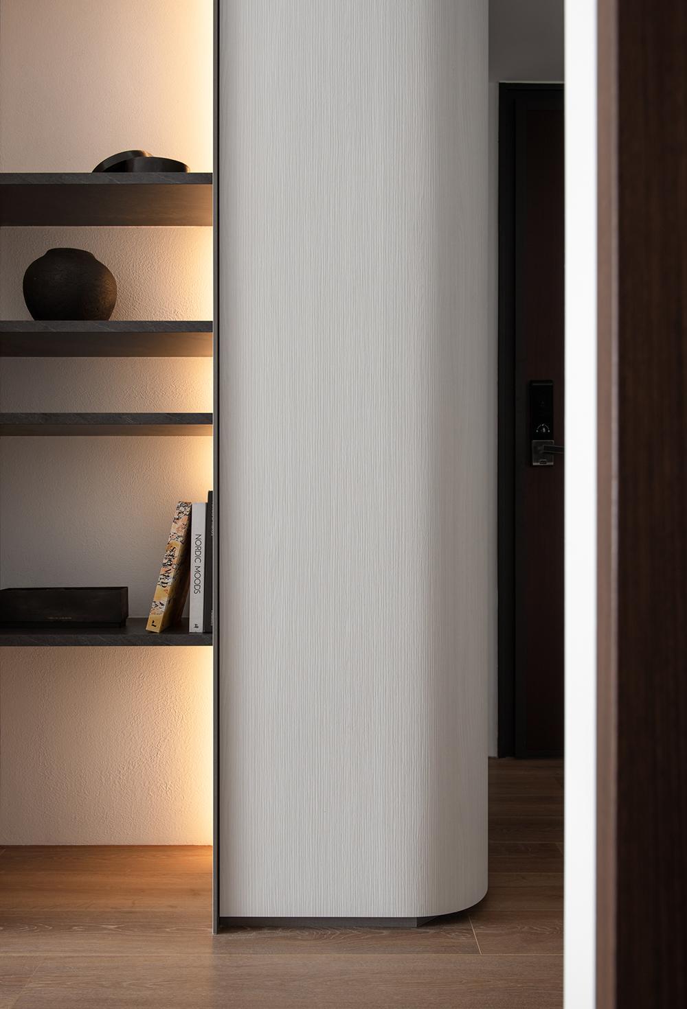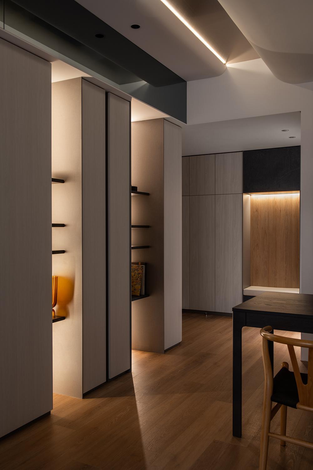 浅水天光映着云隙,微风习习拂来,云朵飘忽卷曲形貌,向来是文人笔下之诗,设计师说为了实现云间藏光,特意增加家中的弧形线条,消除天花结构的锐利感,更巧妙将横梁、中央空调、管道等藏匿其中。