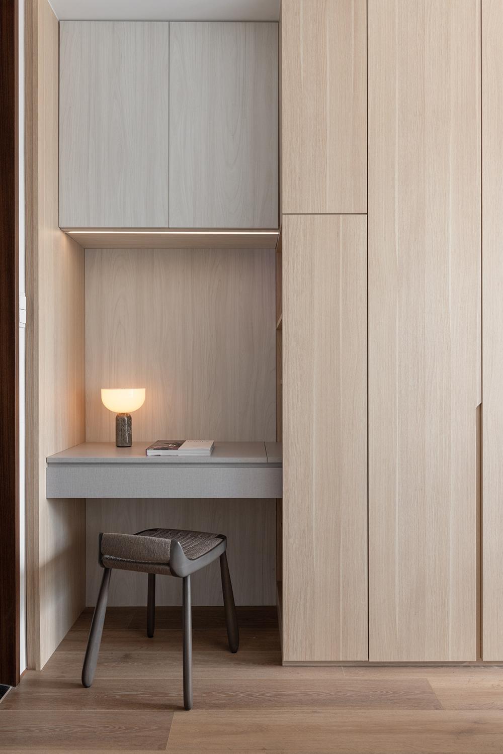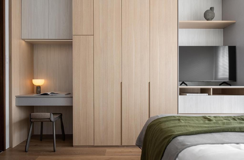 以橡木、白色榆木装饰立面,用颜色区分了衣柜和梳妆台的功能划分。