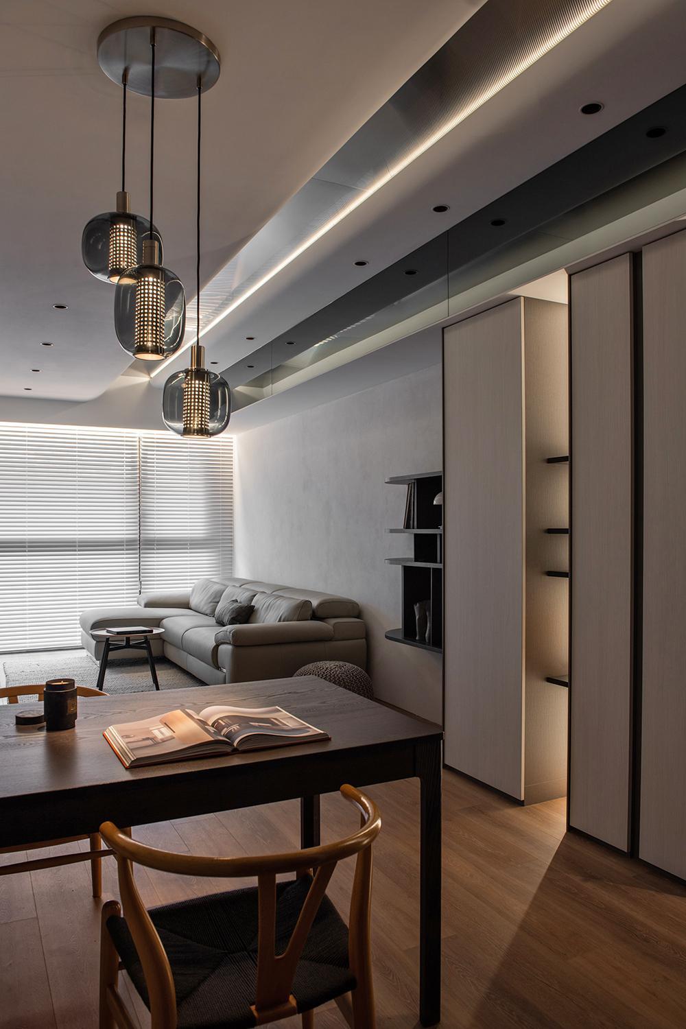 为了不如餐桌占太大面积,保存客厅动线,选用伸缩式餐桌,一盏轻盈的灰色玻璃材质吊灯,与屋内选材相互烘托。