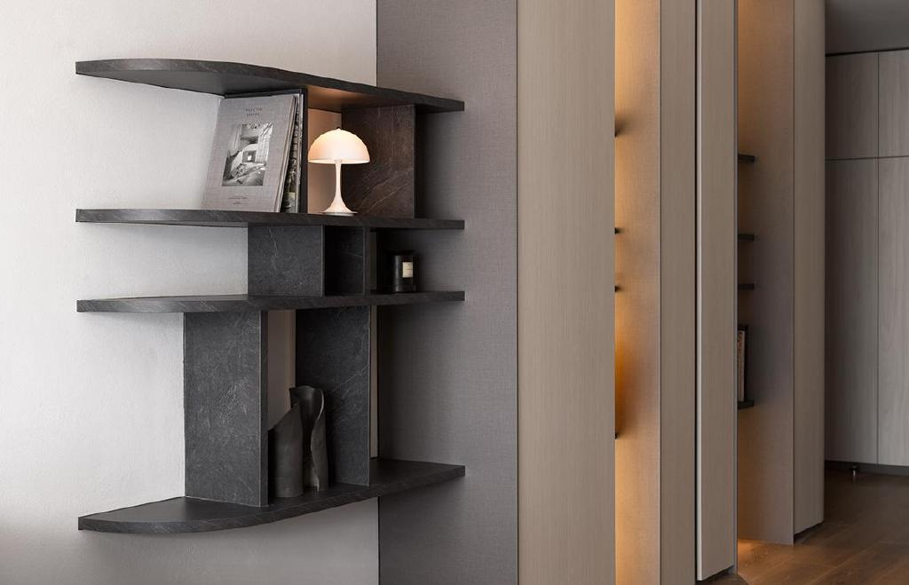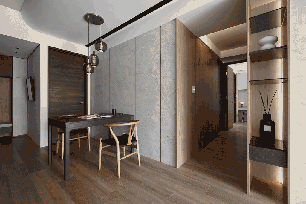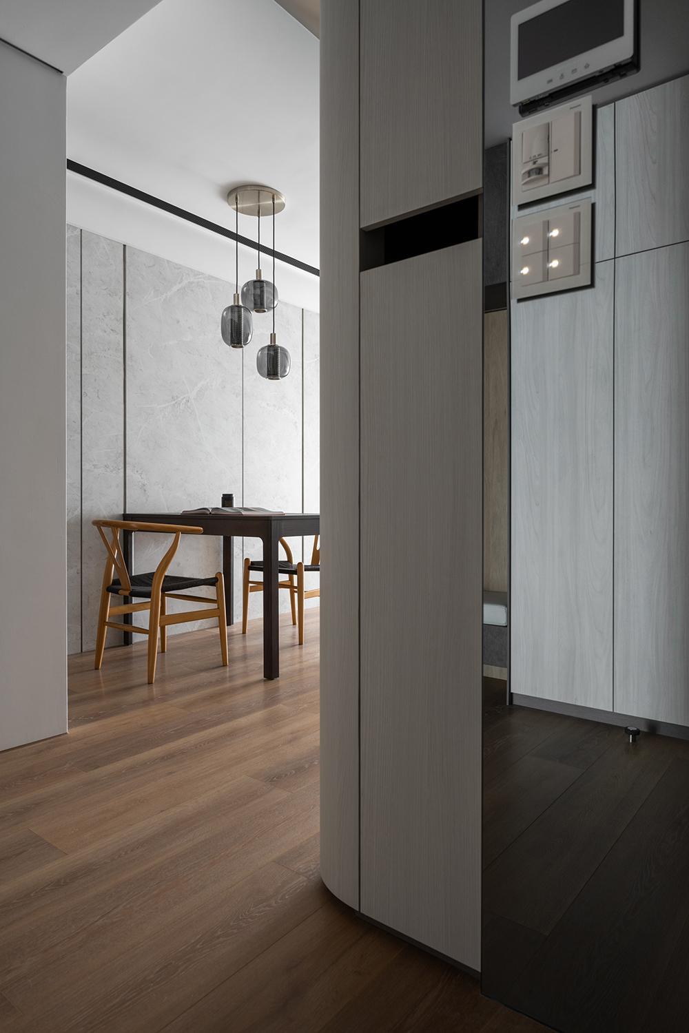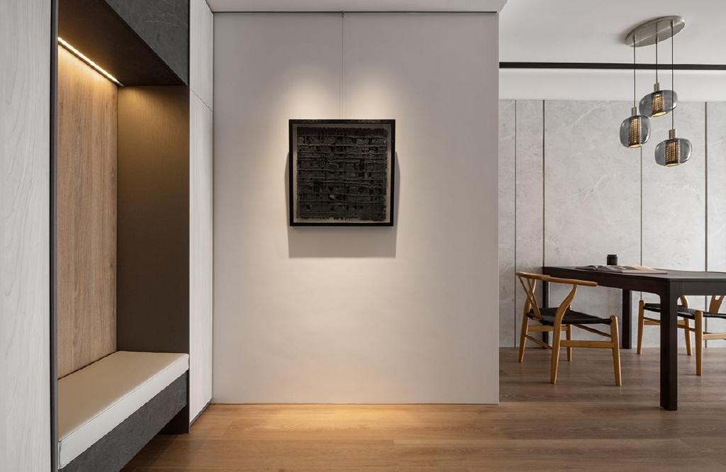 入户门的另一侧增设自动感应式灯光,当一盏光影绽亮时,便能轻柔包容归返家之心绪,玄关更是一道与外为界的大门。