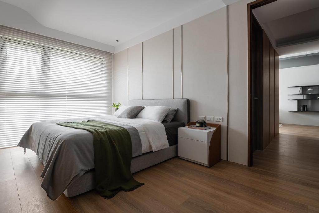 卧室的设计风格与客厅保持一致,以布纹壁纸、镶嵌凸面镀钛围塑床背板,由于天花板是倾斜的,所以无法放置普通吸顶灯或吊灯,选用内嵌式射灯照明,并将曲弧勾勒于衣柜侧上方。