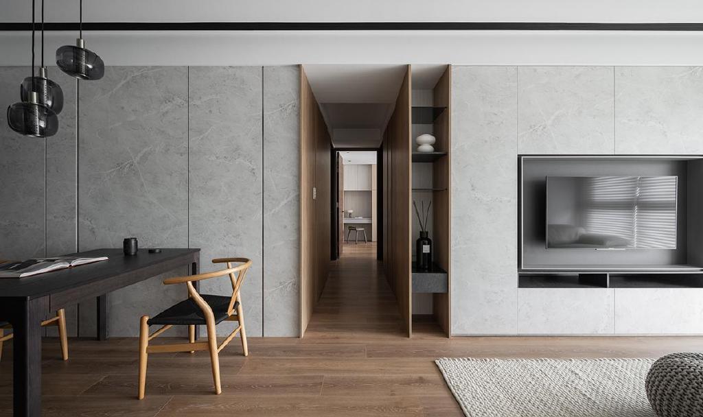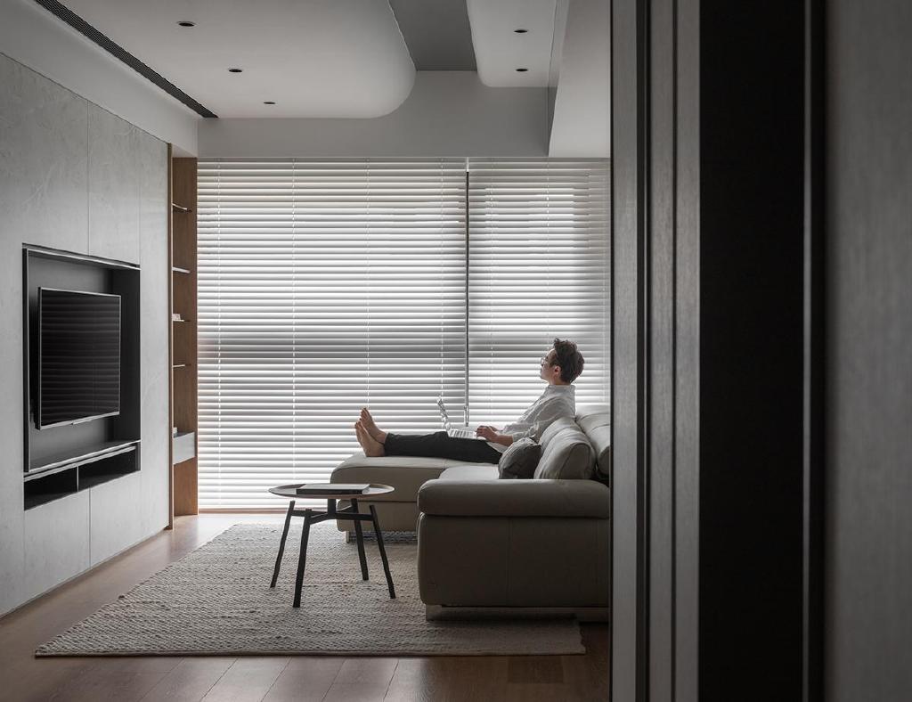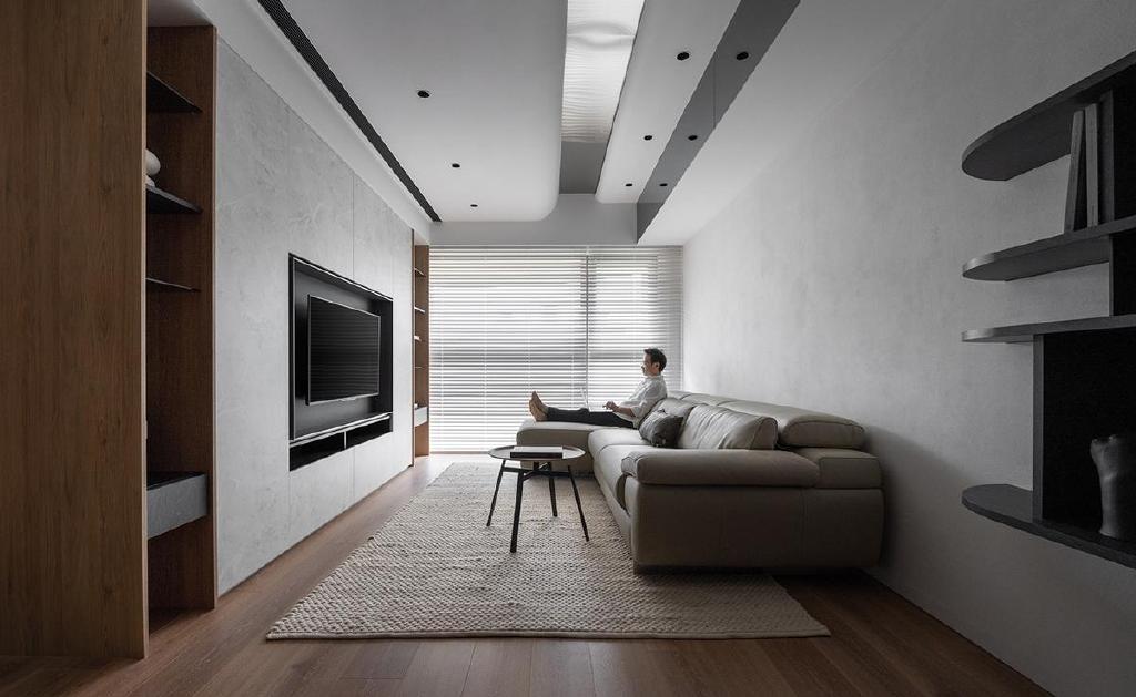 深灰色的电视背景,深化了视觉,也与电视瞬时相融。沙发后方使用调节湿度、带有粗犷肌理硅藻土与石纹墙相互映衬,拥抱生活的温润。